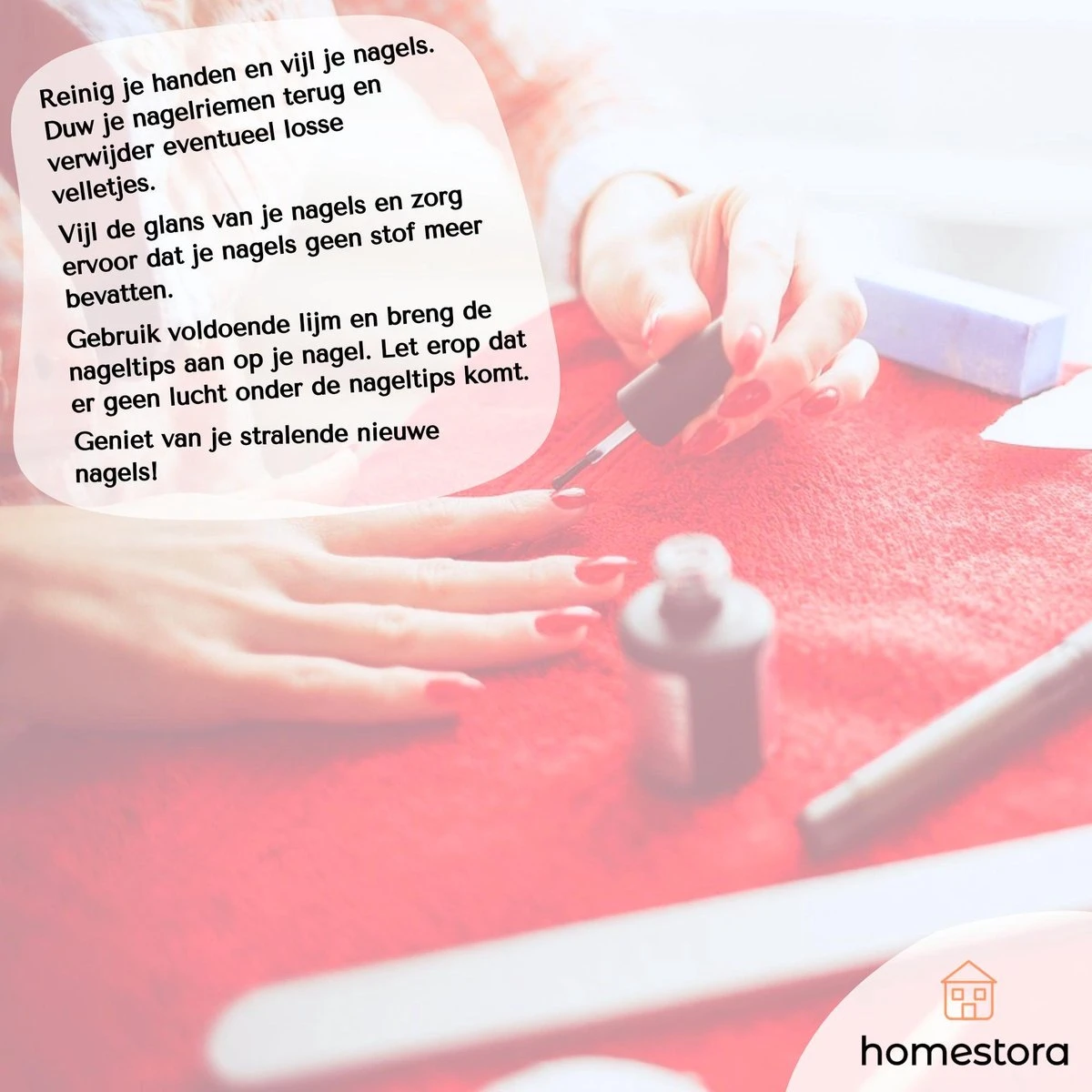 Bestel onze Homestora® nageltips met 10 milliliter nagellijm nu en maak ook van jouw handen een visitekaartje met prachtig verzorgde nagels!